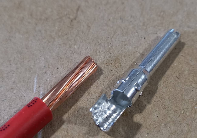 L'extrémité est ensuite insérée dans la partie arrière de la fiche. Le sertissage est fait à la pince à bec, puis le sertissage est consolidé par soudure à l'étain: