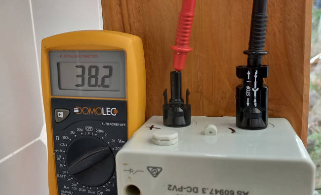 Voilà. Nos 10 panneaux sont raccordés à l'entrée du sectionneur DC. Avant d'injecter le courant des panneaux vers l'onduleur hybride, nous vérifions, en sortie des fiches MC4 du sectionneur DC que la tension des panneaux est bien présente et que la polarité + et - est bonne: