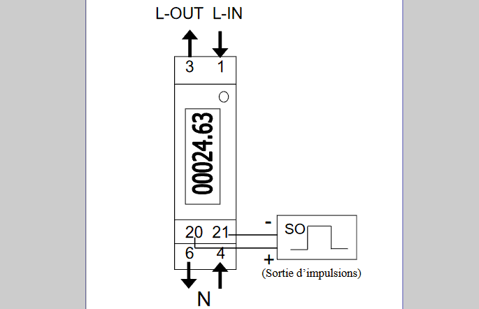 Il est impératif de respecter les sens d'entrée et de sortie des fils phase et neutre. Ici, la sortie correspondra à l'arrivée phase et neutre du secteur! Ce compteur ne se câble PAS COMME UN DISJONCTEUR!